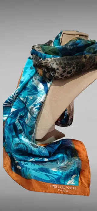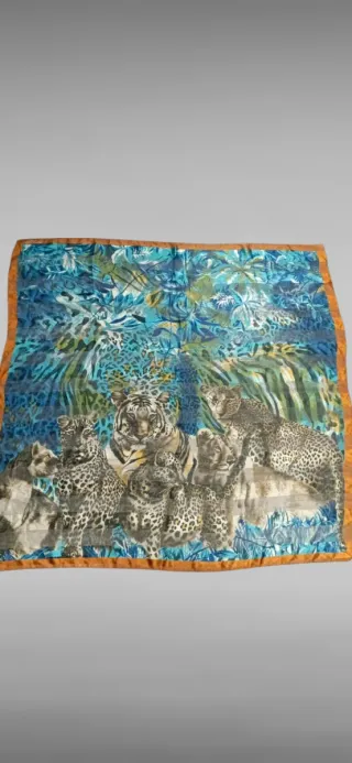 Pañuelo extra grande con un diseño de selva y felinos. - Estampado detallado de tigres y leopardos. - Tonos azules y verdes predominantes. - Borde decorativo en tono ocre.Pañuelo extra grande también se puede usar como pareo , motivos selva de la marca Pier Olivier París. Muy suave y ligero Cuadrado medidas aproximadas 114x114.
