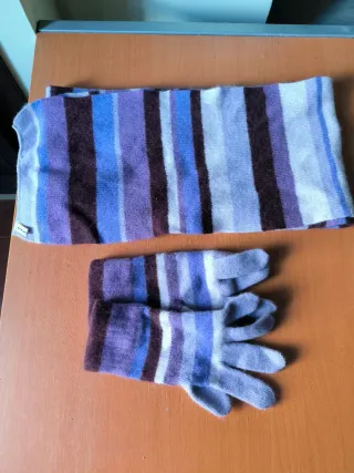 Conjunto de bufanda y guantes a rayas de El Corte Inglés. - Diseño a rayas en tonos morados y azules. - Tejido suave y cálido.