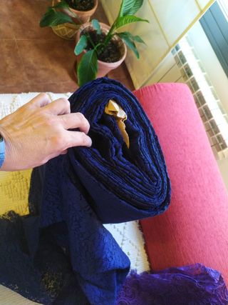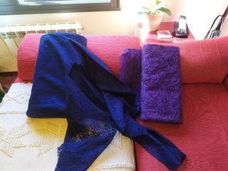 Pack de telas de encaje. Azul marino y morado. En la grande habrá unos 10 metros, no lo se seguro porque tendría que desarmar todo el rollo. Y en la morada unos 5 metros. La azul esta empezada con retales como en la foto, luego esta perfecta
