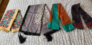 Conjunto de 6 fulares o pañuelos con diseños variados. 4€ todos - morado con bordado. - de rayas multicolores. - tejido multicolor. - azul brillante. - naranja. - turquesa.