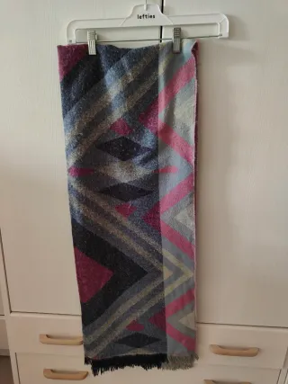 Bufanda reversible con un diseño geométrico llamativo, por un lado son tonos azules y por otro rosas. - Patrón de rombos y zig-zag. - Combinación de colores vibrantes.