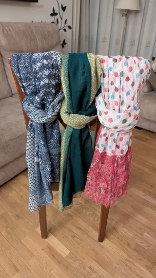 Lote variado de pañuelos y bufandas con diferentes diseños y texturas. El precio es por todos. - Pañuelo a cuadros blanco y negro. - Pañuelo verde con diseño de rombos y borde azul. - Pañuelo rojo con estampado floral. - Pañuelo rosa a cuadros. - Bufanda de rayas grises y blancas. - Bufanda lisa en tono marrón.