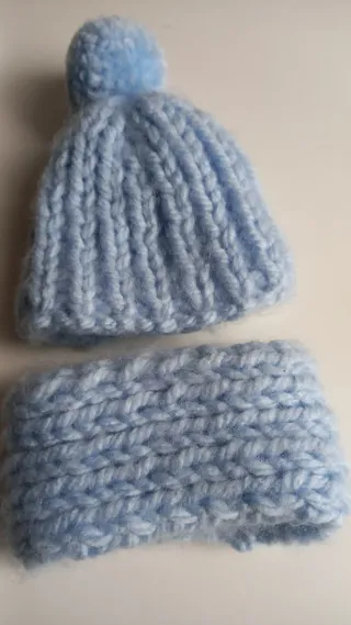 Conjunto de gorro y bufanda tejidos a mano, perfectos para complementar la vestimenta de muñecas. Gorro con un pompon. - Diseño artesanal. - Colores: azul cielo. NO INCLUYE PELUCHE .