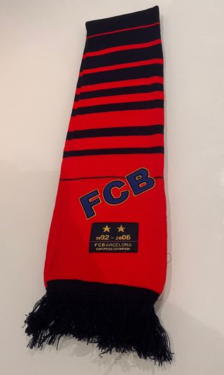 Bufanda del FC Barcelona. PRODUCTO ORIGINAL Presenta el logo FCB bordado y un parche conmemorativo. Tejido extra grueso y suave. - Logo FCB bordado. - Parche 1992-2006 FCBARCELONA EUROPEAN CHAMPION. - Nueva sin usar pero sin etiqueta (Ver reseñas, todo lo que vendo está en perfecto estado)