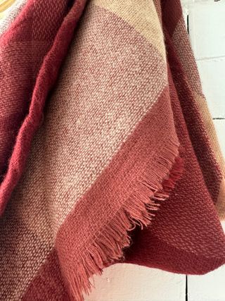 Bufanda suave con diseño a cuadros en tonos rojos y beige. Perfecta para añadir un toque de estilo a tu atuendo. - Diseño a cuadros. - Flecos en los bordes.