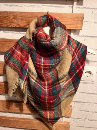 Preciosa pasmina con diseño de cuadros en tonos beige y multicolor. Perfecta para añadir un toque de estilo. - Diseño de cuadros clásico. - Medidas aproximadas de 40x40 cm.