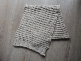 Bufanda tejida a mano con un diseño de punto grueso y flecos en los extremos. Su tono neutro la hace muy versátil. - Material: Lana. - Color: Beige. - Diseño: Punto grueso con flecos.