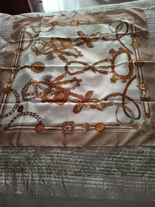 Elegante pañuelo con un diseño de cadenas y hebillas en tonos beige y dorado. - Estampado detallado. - Borde en color beige. Poliéster.