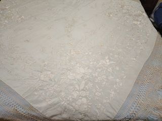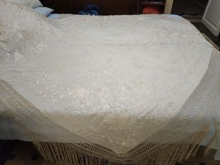 Auténtico mantón de Manila de época, con un diseño floral intrincado y delicado. Un accesorio elegante y atemporal. - Bordado floral detallado. - Flecos largos y abundantes. - Tejido de seda .