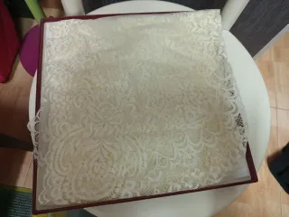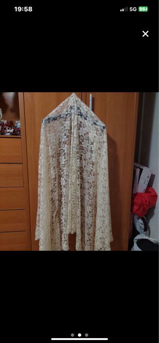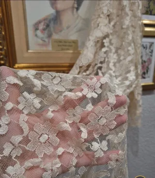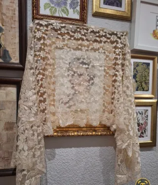 Elegante mantilla de encaje en color beige. Su diseño intrincado la hace perfecta para ocasiones especiales. - Encaje floral detallado. - Borde festoneado. Para fallera o traje regional, medidas 1,20 X 2,70 centímetros. Precio cerrado.