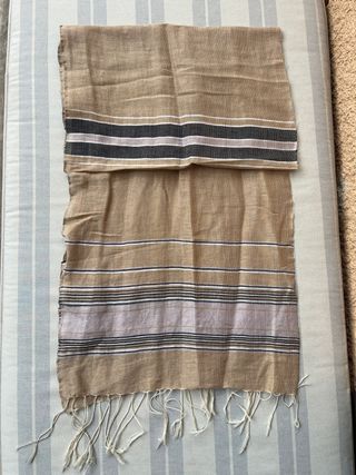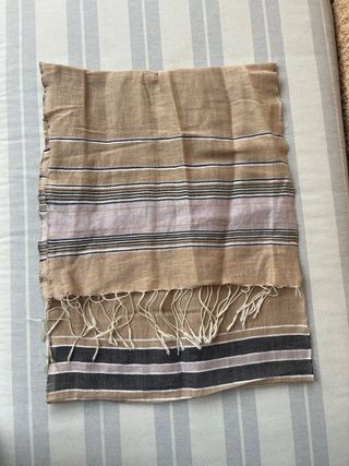 Bufanda o pañuelo muy ligero con un diseño de rayas. Mide 190 × 45 Está en buen estado, aunque tiene una pequeña mancha de rotulador y un pequeño rasgado en un lado, ver últimas dos fotos. - Tejido fino y transpirable. - Adornos de flecos en los extremos. Más accesorios y ropa similar en mi perfil, haz un lote para ahorrar en el envío.