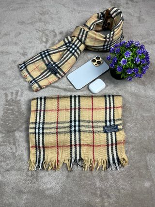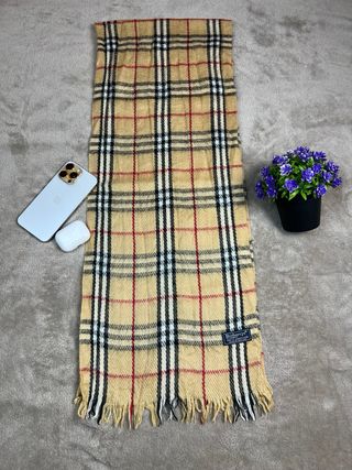 Bufanda de lana con el icónico estampado tartán de Burberry. - Diseño clásico en tonos beige, negro y rojo. - Acabado con flecos en los extremos. - Suave al tacto.