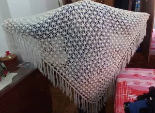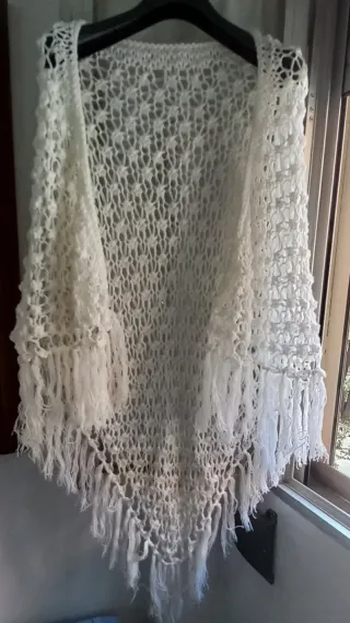 Chal de fallera tejido a mano con un diseño intrincado y flecos. - Tejido de lana beige. - Diseño calado. - Flecos largos en el borde inferior. Mide de ancho 150 cm y de largo 120 cm.