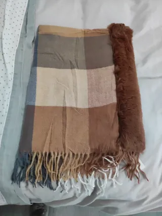 Bufanda suave con diseño de cuadros en tonos marrones y beige. Presenta un detalle de pelo sintético en uno de los extremos. - Diseño a cuadros - Borde de pelo sintético - Nueva, a estrenar
