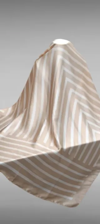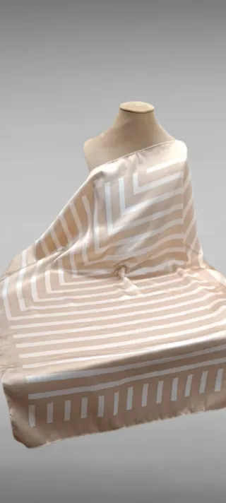 Pañuelo con un diseño geométrico moderno. Elegante pañuelo beige con rayas blancas tacto seda, muy suave y ligero. C&A. Medidas aproximadas 71x74 - Estampado de líneas blancas sobre fondo beige. - Tejido satinado con caída. - Ideal para complementar cualquier atuendo.
