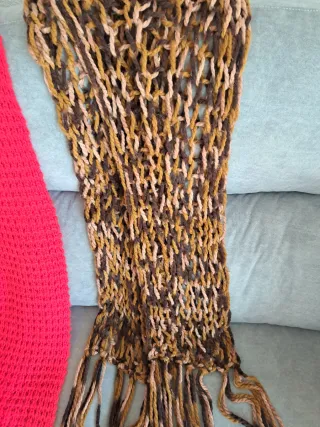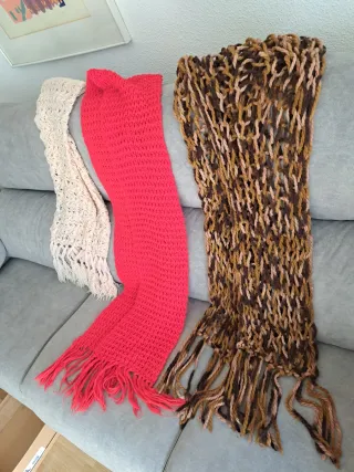 Conjunto de tres bufandas largas tejidas a mano, perfectas para complementar tu estilo.Regalo la rosa palo la que esta en la última foto. NO HAGO ENVÍOS - Bufanda de color crudo con un diseño calado. - Bufanda de color rojo vibrante con flecos. - Bufanda multicolor en tonos marrones y beige con un tejido grueso y abierto.