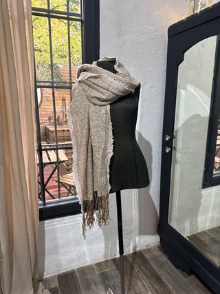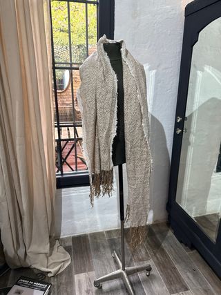 Chal de lana en color beige, completamente nuevo. - Tacto suave y cálido. - Diseño con flecos en uno de los extremos.
