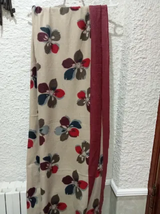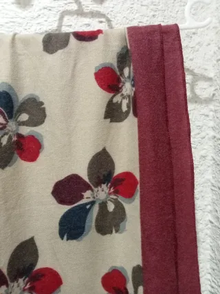 Preciosa pasmina de abrigo con un diseño floral llamativo. Es suave y cálida, perfecta para complementar tu atuendo. - Diseño de flores en tonos burdeos azules y beige - Borde liso en color burdeos.tiene un avión q apenas de aprecia