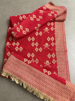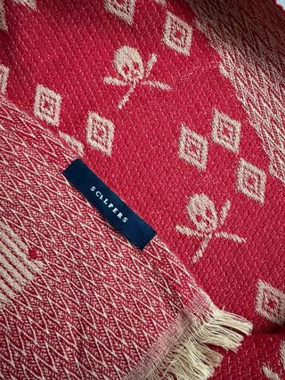 Bufanda de la marca Scalpers con un diseño llamativo. - Tejido principal en color rojo. - Estampado de calaveras y rombos en tono beige. - Borde con diseño geométrico y flecos. - Tacto suave y agradable.