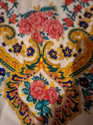 Precioso pañuelo con un diseño floral vibrante y un borde de flecos. - Diseño floral detallado. - Borde con flecos. - Base en color blanco roto.