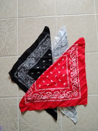 Conjunto de tres pañuelos con diseño clásico. - Pañuelo negro con estampado blanco. - Pañuelo rojo con estampado blanco. - Pañuelo blanco con estampado negro. - Cuadrados 51x51cm - Se venden los 3 juntos por el precio marcado. NUNCA SE HAN USADO Instagram @mis_rapacines