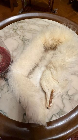 Este es un cuello de pelo auténtico en color blanco y beige. Es un accesorio elegante y suave. - Pelo natural de alta calidad. - Color blanco y beige. - Pinza para sujetar.