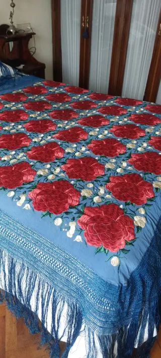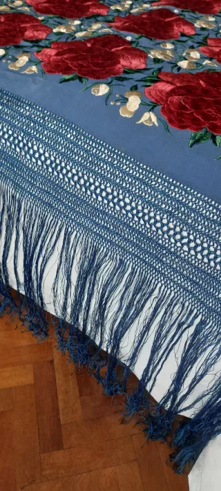 Mantón de Manila bordado azul y rojo
