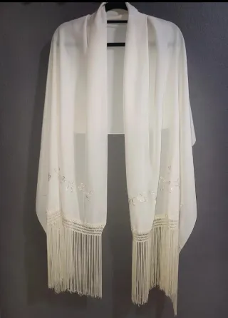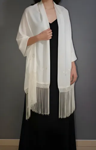 Elegante mantón de color blanco, perfecto para complementar atuendos. - Elaborado con delicados bordados florales. - Adornado con flecos largos y finos en todo el borde.