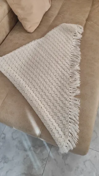 Elegante mantoncillo tejido a mano, perfecto para complementar tu atuendo. - Color blanco. - Diseño con flecos en los bordes. - Tejido de punto fino.