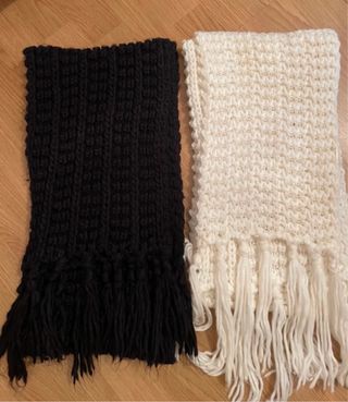 Conjunto de dos bufandas de lana de la marca Stradivarius. Una es de color negro y la otra de color blanco roto, ambas con un diseño tejido y flecos en los extremos. - Bufanda negra con flecos. - Bufanda blanca con flecos.