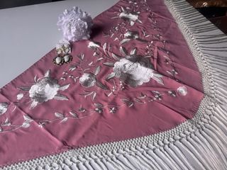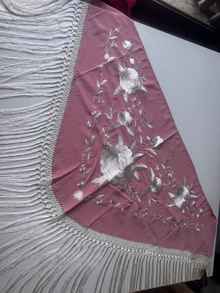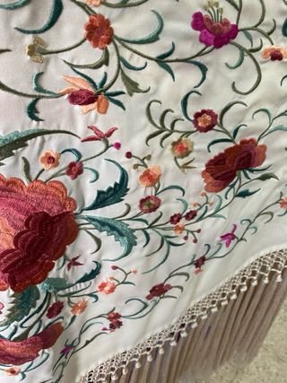 Mantón de Manila con bordados y flecos a juego. Tiene forma triangular, con unas medidas de 160 × 80 cm más 18 cm de flecos. Nuevo, sin estrenar