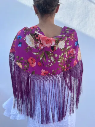 Mantoncillo floral morado con flecos