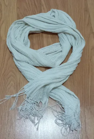 Pañuelo de tejido calado en color blanco. 160cm de largo y 30cm de ancho. Tiene un agujerito y algún hilo suelto