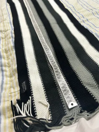 Bufanda con un diseño de rayas en blanco, gris y negro. Perfecta para añadir un toque de estilo a cualquier atuendo. - Diseño de rayas verticales. - Acabado con flecos en los extremos.