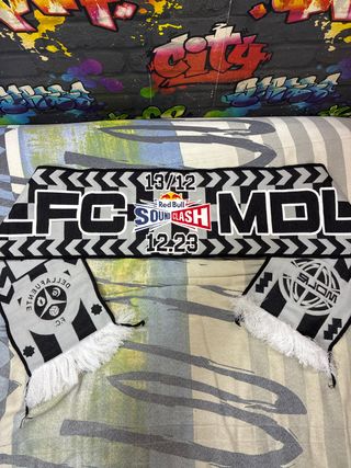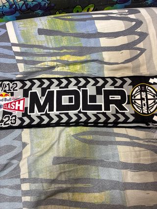 Bufanda de punto con un diseño llamativo. Presenta letras blancas sobre fondo negro, con detalles en rojo y rayas doradas y grises en los extremos. - Diseño de letras blancas. - Detalles en rojo. - Rayas doradas y grises en los extremos.