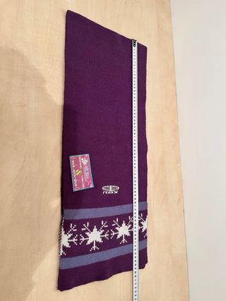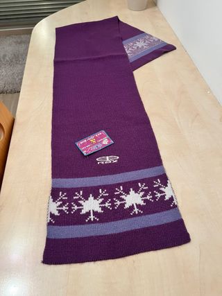 Bufanda de punto de la marca ROX con un diseño invernal. - Color morado con detalles blancos y lilas. - Motivos de copos de nieve en los extremos. - Etiqueta original incluida.