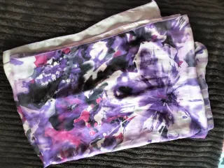 Elegante fular con un estampado floral vibrante. Su diseño abstracto combina tonos de púrpura, rosa y toques oscuros sobre un fondo blanco, creando un efecto acuarela. - Diseño floral abstracto. - Tejido ligero y fluido. - Acabado con costura fina en los bordes.