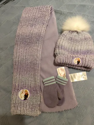 Conjunto de invierno para niña con temática de Frozen. Incluye bufanda, gorro y manoplas. - Gorro de punto con pompón blanco. - Bufanda de punto con detalles brillantes. - Manoplas a juego con puño a rayas. - Parche de Elsa y Anna en gorro y bufanda. (4 a 6 años aprox)
