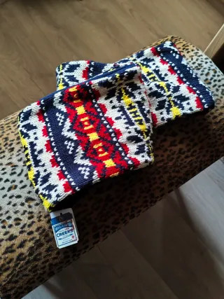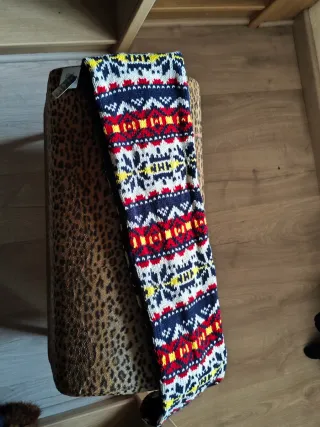 Bufanda tipo cuello o infinita con un diseño llamativo y colorido. - Tejido de punto con patrón geométrico. - Combinación de azul marino, blanco, rojo y amarillo.