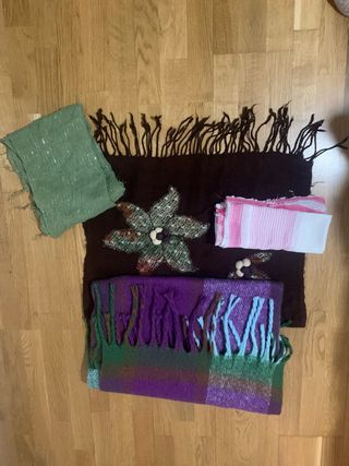 Conjunto de pañuelos y bufandas con diferentes diseños y texturas. - Pañuelo verde con detalles brillantes playeados - Bufanda marrón con flecos y aplique de flor. - Pañuelo blanco y rosa a rayas. - Bufanda de cuadros morada y verde con flecos, muy abrigado para invierno