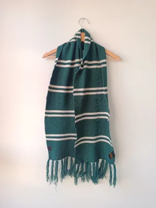 Bufanda de Slytherin de Harry Potter, con el diseño clásico de rayas. - Diseño a rayas verdes y blancas. - Con flecos en los extremos. - Ideal para fans de Harry Potter. - De lana, muy abrigosa y calentita