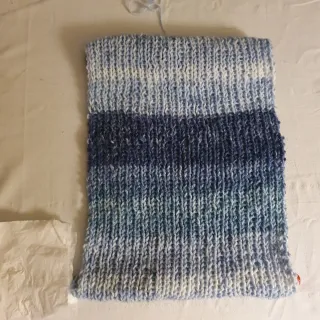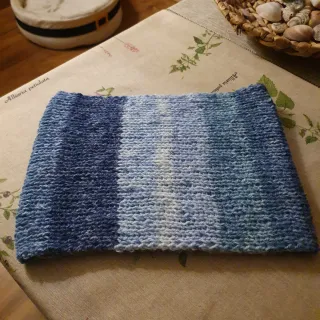 Cuello tipo buff tejido a mano con lana. Medidas aproximadamente 21× 30 se estira al.ponerlo una vuelta.Unisex - Diseño degradado en tonos azules y blanco. - Textura suave y cálida.