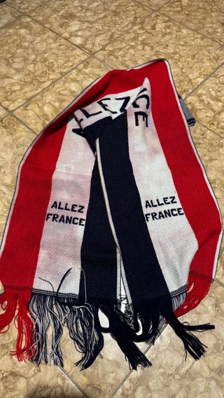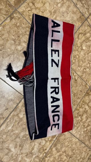 Bufanda con diseño tricolor y el lema Allez France. - Tejido de punto. - Flecos en los extremos. - Diseño a rayas rojas, blancas y azules.