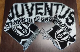 Bufanda del equipo de fútbol Juventus. - Diseño con el nombre del equipo y el lema Historia di un grande amore. - Escudo del club en los extremos. - Flecos en los bordes.