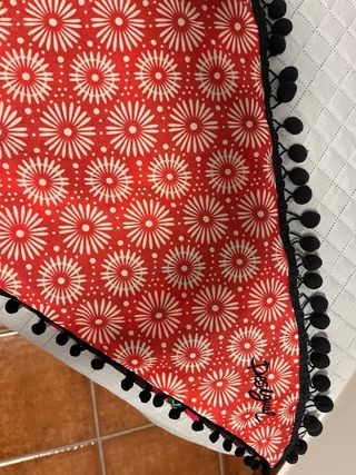 Pañoleta con diseño desigual y detalles de pompones negros. - Tejido principal a rayas rojas y negras. - Panel con estampado geométrico en amarillo, verde y negro. - Panel con estampado floral en rojo y blanco. - Adornada con pequeños pompones negros en el borde.