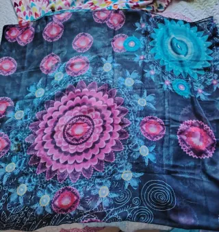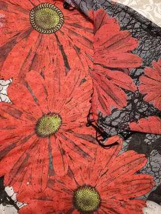 Foulard de la marca Desigual, muy grande, multicolor, con estampado de flores, tejido fino y agradable.