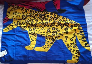 Foulard de lino con un diseño vibrante y lleno de detalles. - Estampado artístico con motivos florales, animales y elementos veraniegos. - Tejido de lino ligero y transpirable.