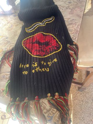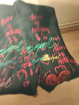 Bufanda de punto con un diseño llamativo. - Bordados de texto y corazones en rojo y otros colores. - Textura acanalada. - Detalle de dos corazones aplicados en la parte inferior.