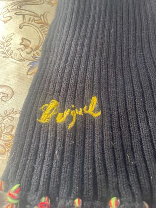 Bufanda de la marca Desigual con un diseño llamativo. - Tejido de punto acanalado. - Bordado de hilo amarillo. - Adornos de pompones multicolor en el borde.