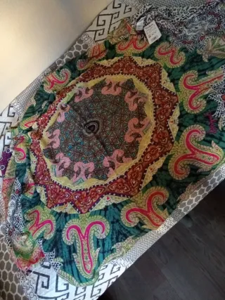 Mide 200x105 cm Pañuelo grande con un diseño vibrante y lleno de color. Perfecto para añadir un toque distintivo a cualquier atuendo. - Estampado llamativo con motivos florales y paisley. - Tejido ligero y suave al tacto. - Medidas amplias para diversas formas de llevarlo.